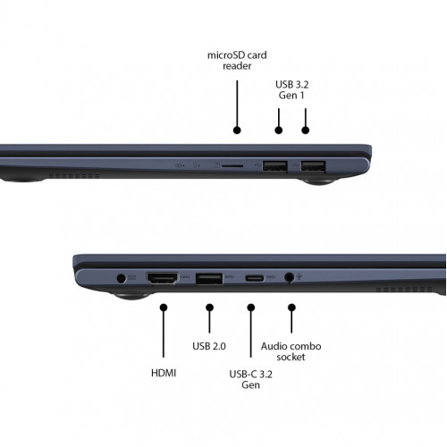 VivoBook 14 features a reversible USB 3.2 Gen 1 Type-C™ port with an any-way-up design that makes connecting devices effortless. It also includes USB 3.2 Gen 1 and USB 2.0 ports, HDMI output, and a microSD card reader — so you can easily connect all your current peripherals, displays and projectors.